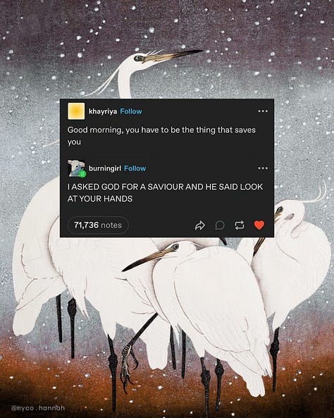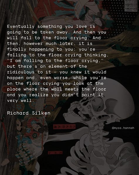 I’ll never tell you to see your grief and loss as a gift— fuck that. It’s not a gift. It is a monster. But it’s not there to get you. It’s just there.